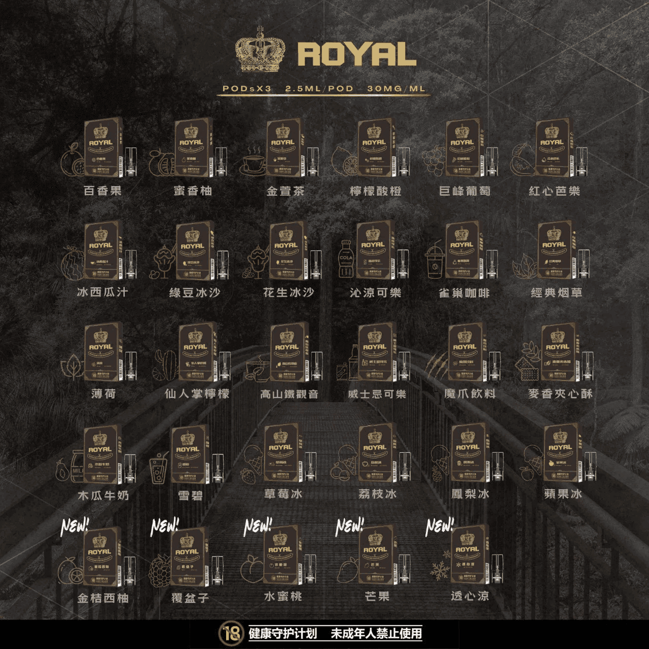 仙人学桲檬, 木瓜牛奶, 紅心芭樂, 草莓冰, 金萱茶, 魔爪歆料, 冰西瓜汁, 檸檬酸橙, 經典菸草, 荔枝冰, 雀巢咖啡, 鳳梨冰, 威士忌可樂, 巨峰葡萄, 沁涼可欒, 百香果, 綠豆冰沙, 花生冰沙, 薄荷, 蘋果冰, 蜜香柚, 雪碧, 高山鐡觀音, 麥香夾心酥